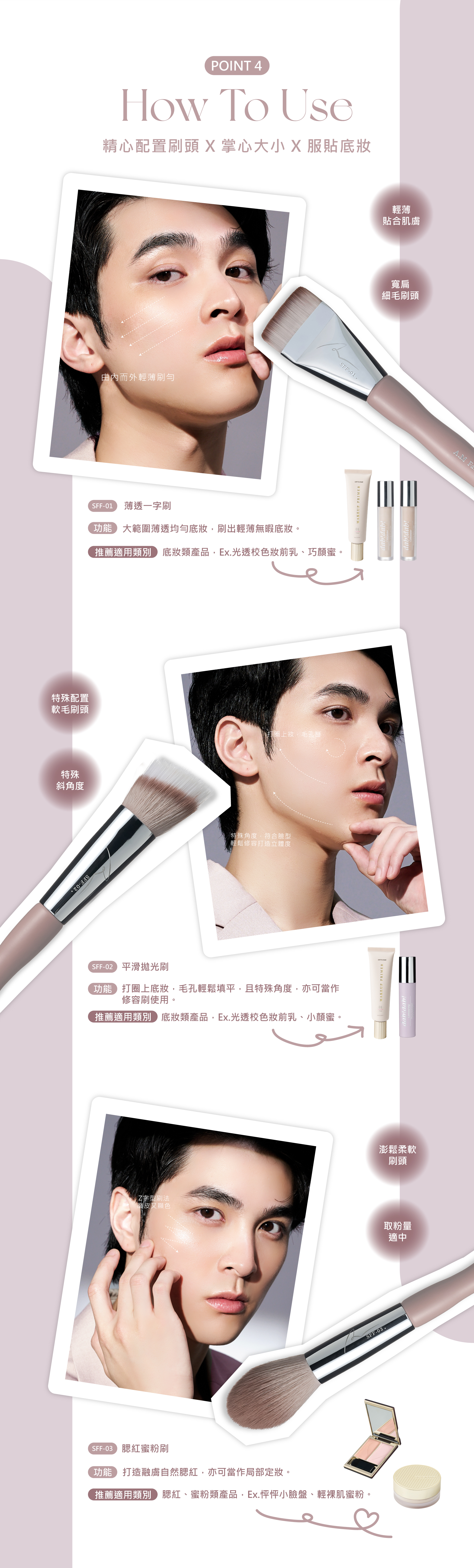 特殊配置軟毛刷頭,打圈方式上底妝,